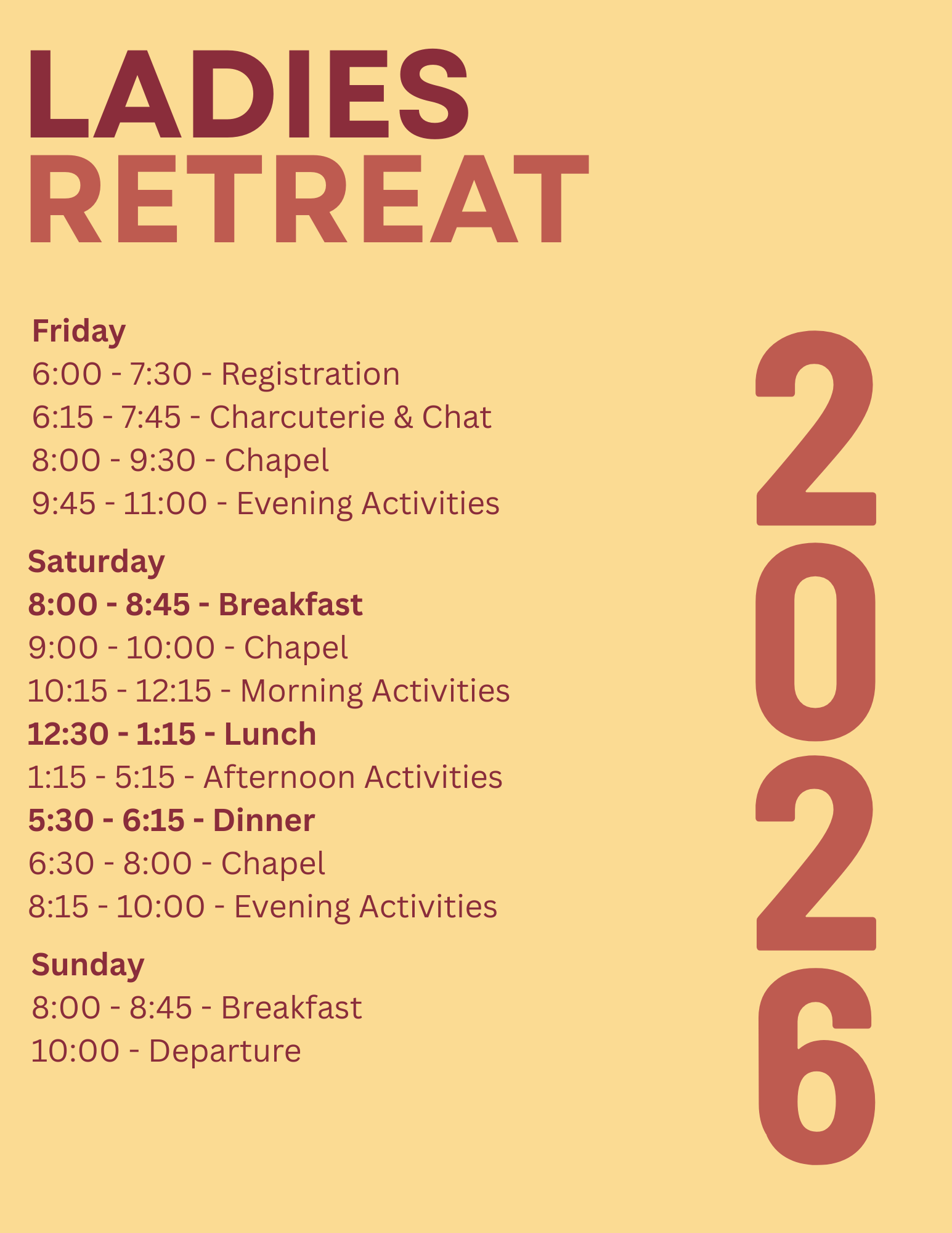 LADIES RETREAT CHECK-OUT: Sunday Morning (Following Breakfast)